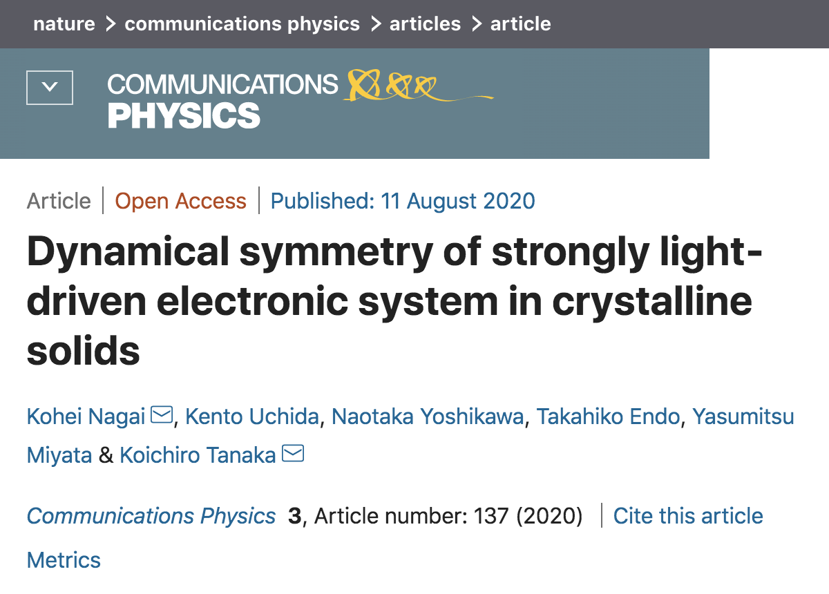 永井君(D2)の論文がNature系の雑誌であるCommunications Physicsに掲載されました。おめでとう!! 我々の研究室では、強いレーザー光は光と物質が一体となった状態を作り出すことや新たな機能を創出を目指して、高強度レーザー光と固体との相互作用を研究しています。ここで重要なキーワードが「動的対称性」と呼ばれる新たな概念です。この「動的対称性」は理論的に提案されていましたが、固体における実験的検証はほとんどありませんでした。我々は赤外域の高強度レーザー光を物質に照射し、その状態において現れる動的対称性を光散乱過程の系統的な研究により検証しました。(2020/8/20)
